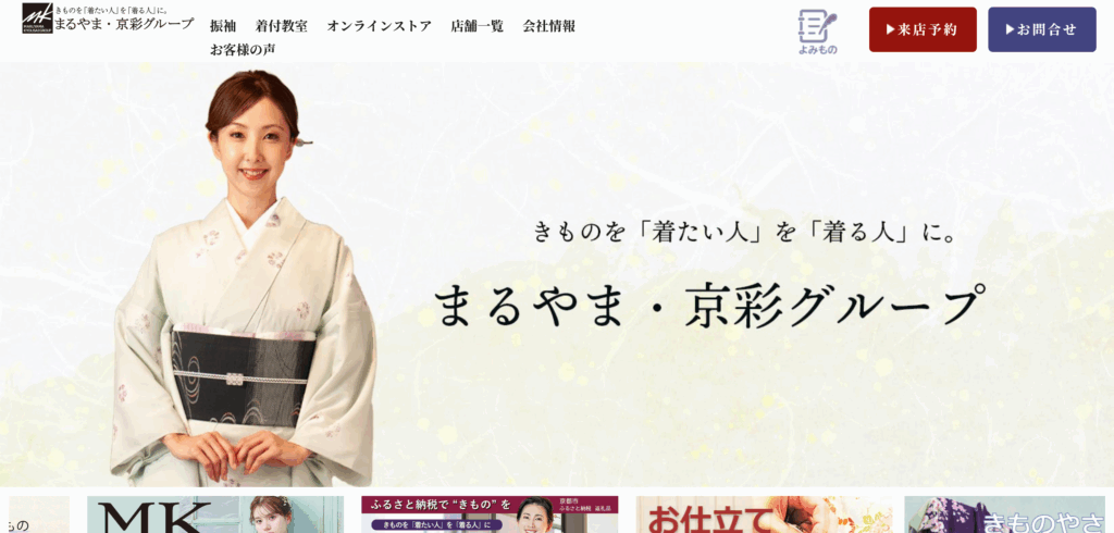 日本最大級の店舗ネットワークを誇る「まるやま・京彩グループ」は、振袖レンタルからリユース着物「たんす屋」まで幅広く展開する着物専門店グループです。最新トレンドを反映したオリジナル振袖カタログ『MK style』を発行し、購入・レンタル・ママ振袖など多様なニーズに対応。プロの着付師やフォトスタジオを擁し、成人式の準備を一括でサポートします。「着たい人を着る人に」を掲げ、初心者でも安心して楽しめる質の高いサービスが魅力です。