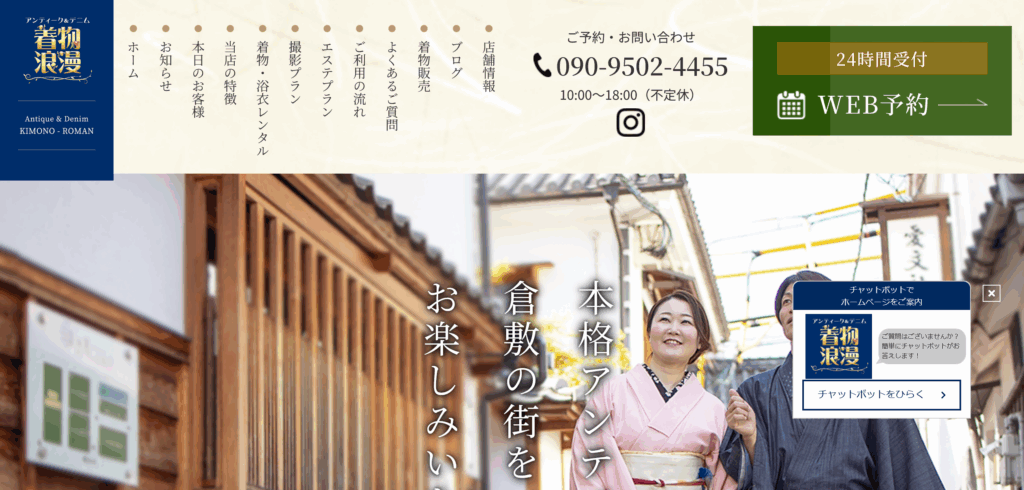 岡山県倉敷美観地区に位置する「着物浪漫」は、本格的なアンティーク着物のレンタル・販売を行う専門店です。観光用のカジュアルな散策プランから、成人式や卒業式向けの振袖・袴プランまで幅広く提供。最大の特徴は、フェイシャルエステとプロによる撮影がセットになったプランがある点です。デニム着物など倉敷らしい衣装も揃い、歴史ある街並みに映える上質な着こなしを、手ぶらで気軽に楽しむことができます。