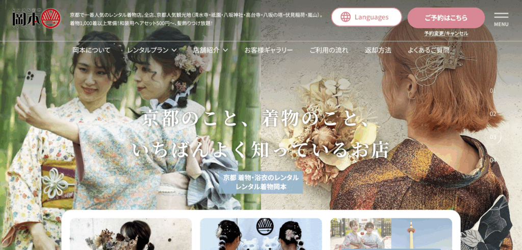 京都でレンタル着物発祥の店とされる「レンタル着物岡本」は、清水寺や祇園など主要観光地に店舗を構える老舗です。1,000着を超える圧倒的な在庫数を誇り、手軽なセットプランから本格的な装いまで、観光客のニーズに合わせた多彩なプランを展開。プロによる着付けや格安の本格ヘアセットも好評です。ホテル返却や他店舗返却などの便利なオプションも充実しており、手ぶらで一日中京都観光を満喫できるサービスが整っています。