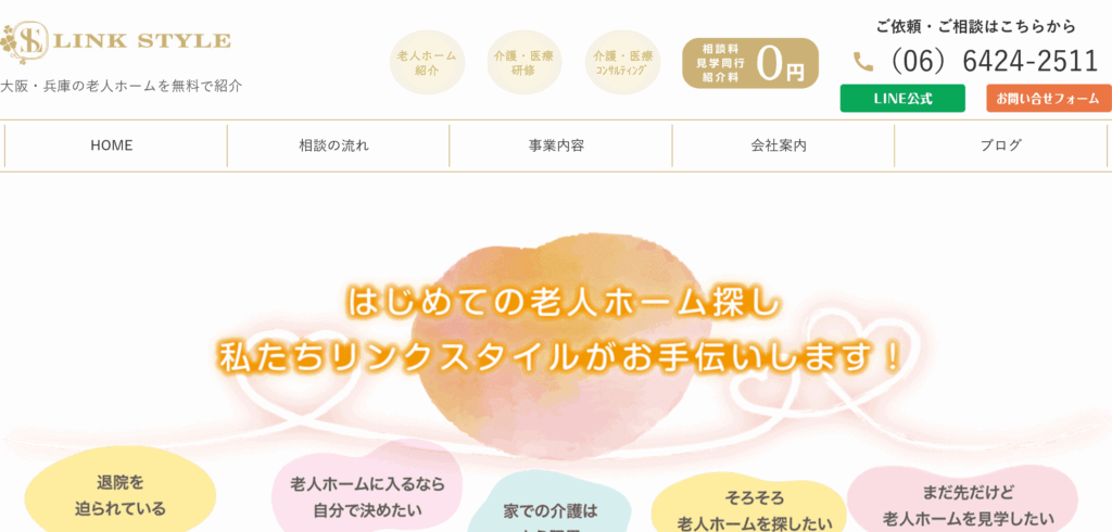 リンクスタイルは、兵庫県(神戸・阪神エリア)および大阪府を拠点とする老人ホーム無料紹介センターです。介護の専門知識を持つ相談員が、施設選びの提案から見学同行、入居手続きまで一貫してサポートします。最大の強みは不動産事業も手掛けている点で、入居に伴う自宅の売却や片付け、空き家管理といった住み替えに関わる課題をワンストップで解決可能です。地域に密着した情報網により、最適な住まい探しを支援しています。