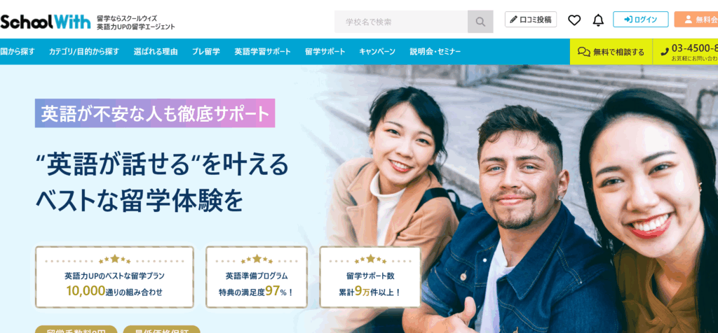 「スクールウィズ(School With)」は、利用者によるリアルな口コミと、留学前後の英語学習サポートに強みを持つ国内最大級の留学エージェントです。フィリピンをはじめ、欧米諸国やオセアニアなど世界各国の語学学校と提携しており、実体験に基づいた中立的な視点で最適なプランを提案します。最大の特徴は、独自の事前学習プログラム「プレ留学」やオンライン英語学習支援など、単なる手続き代行にとどまらない「英語力向上」を目的とした一貫したサポート体制です。代理店手数料が無料で、費用を抑えながら確実に成果を出したい留学生から高い支持を得ています。