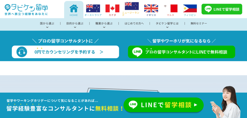 「タビケン留学」は、オーストラリアやカナダを中心に、手数料無料で渡航準備から現地生活までをフルサポートする留学エージェントです。スタッフ全員が留学・ワーホリ経験者のプロであり、2カ国留学や専門留学、ラグビー留学といった目的別のプラン提案に強みを持っています。特に、学校の正式出願窓口として「最低価格保証」を掲げており、費用を抑えながらも、キャリアアップを見据えた質の高い留学体験をトータルで支援しています。