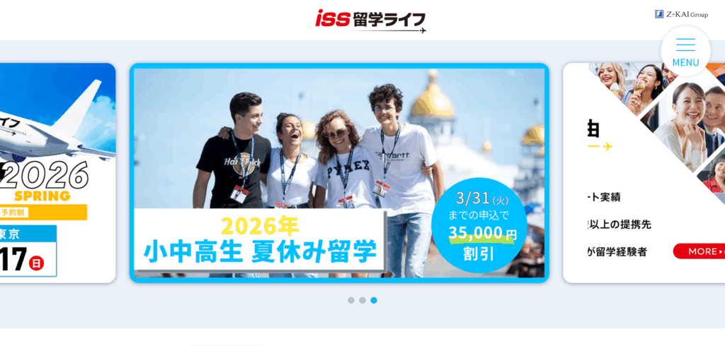 「ISS留学ライフ」は、Z会グループが運営する35年以上の歴史と10万人以上のサポート実績を誇る留学エージェントです。小学生からシニアまで幅広い年代を対象に、世界各国の語学留学、ワーキングホリデー、親子留学などの多彩なプランを提供しています。航空券付きのパッケージプランや、24時間体制の現地日本語サポートなど、大手ならではの安心感と一貫した支援体制が最大の強みです。