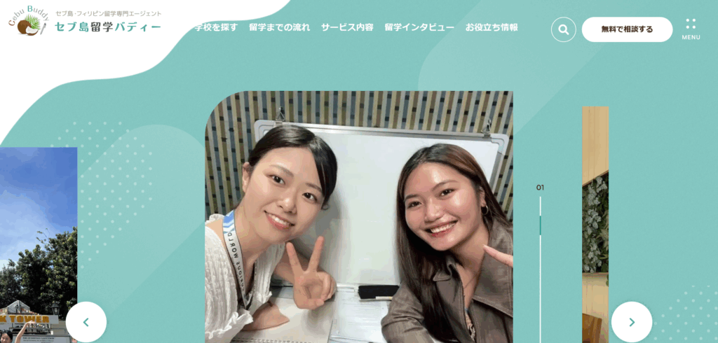「セブ島留学バディー」は、現地在住スタッフによるリアルな情報提供と、手数料無料・最低価格保証を掲げるフィリピン留学特化型のエージェントです。語学学校での勤務経験を持つカウンセラーが、メリットだけでなくデメリットも包み隠さず伝える誠実なサポートが特徴です。セブ現地に拠点があるため、渡航後の急なトラブルや生活面の相談にも迅速に対応可能で、初めての留学や親子留学を検討している方でも安心して利用できます。