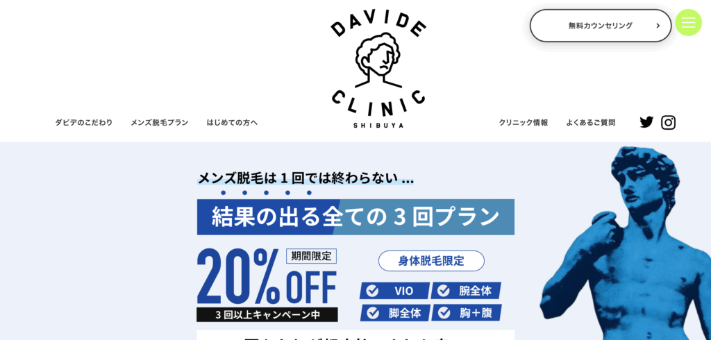 新宿と渋谷に展開するメンズ医療脱毛専門の「ダビデクリニック」は、男性特有の毛質や肌質を熟知した「戦略的脱毛」を提唱するクリニックです。医療従事者による確かな技術と最新のレーザー機器を駆使し、単に毛を減らすだけでなく、一人ひとりの理想に合わせたデザインや肌への負担を最小限に抑えた施術を提供しています。通いやすい立地と予約の取りやすさにも定評があり、効率的に清潔感を高めたいビジネスマンから高い支持を得ています。まずは公式サイトから無料カウンセリングを予約し、自分に最適なプランを相談してみてください。