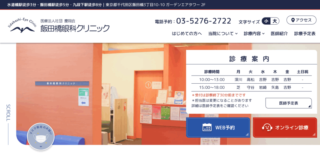 水道橋駅徒歩3分、飯田橋駅徒歩5分。「飯田橋眼科クリニック」。